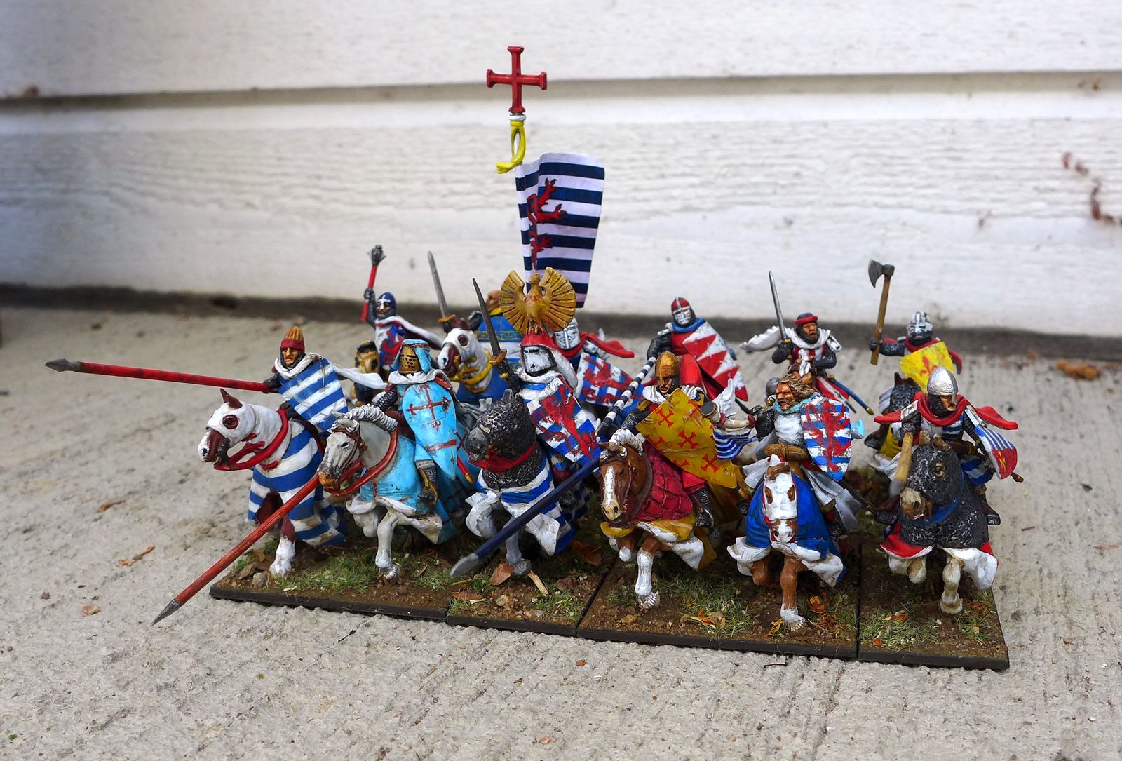 I wanted the most part of them atleast, to belong to the house of Lusignan so I could use them as French knights, but also as knights of the Kingdom of Jerusalem. But I wanted some more variation of colours in the unit so not all of them beloung to the House of Lusignan