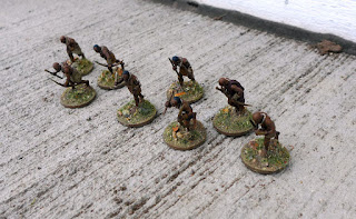 But I wanted to have some dedicated prehistoric miniatures for this to so I used some plastic Perry Miniatures Sudanese tribesmen https://www.perry-miniatures.com/product_info.php?cPath=22_62&products_id=2593&osCsid=t3g5aenafta6r7fusn0185g4a1 as a base for convertion and gave them bows from Conquest Games plastic Medieval archers as I wanted to have some small game hunters with bows and arrows.