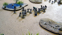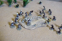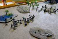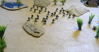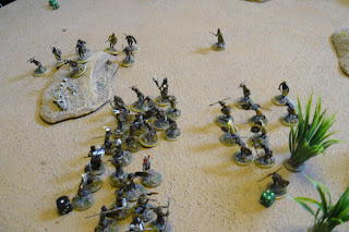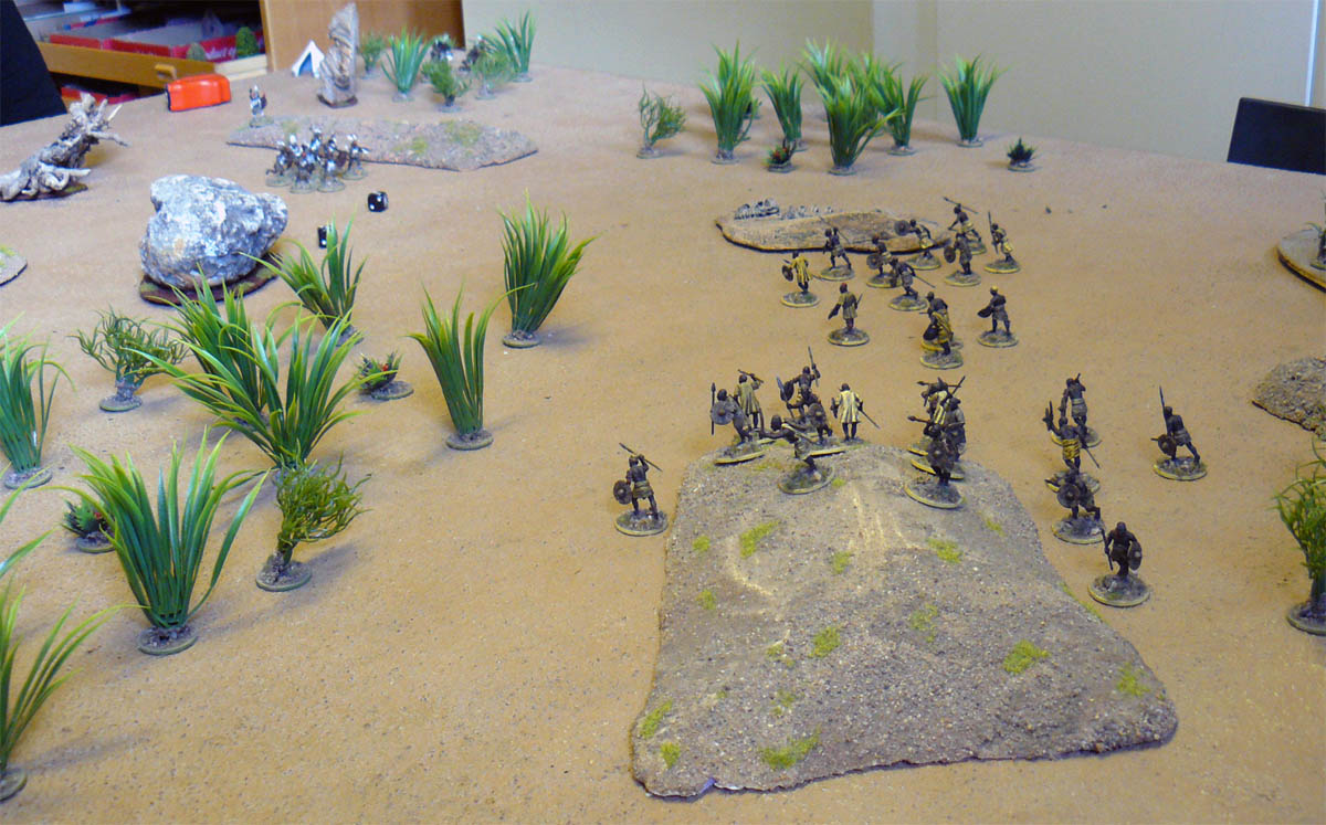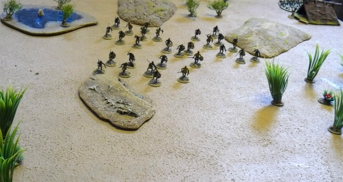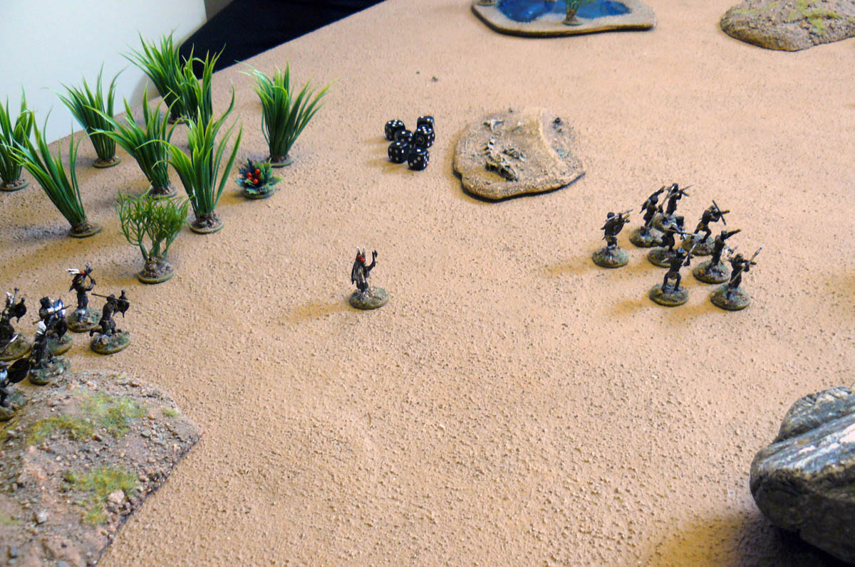 The player of the Hamr tribe was given a deployment area and mustered his warriors. In one of the table edges a witchdoctor was placed at her tent. The Hamr player was told that she would help him if he placed a unit in base to base contact. What she does or what rules she had I kept a secret for the players at that time.