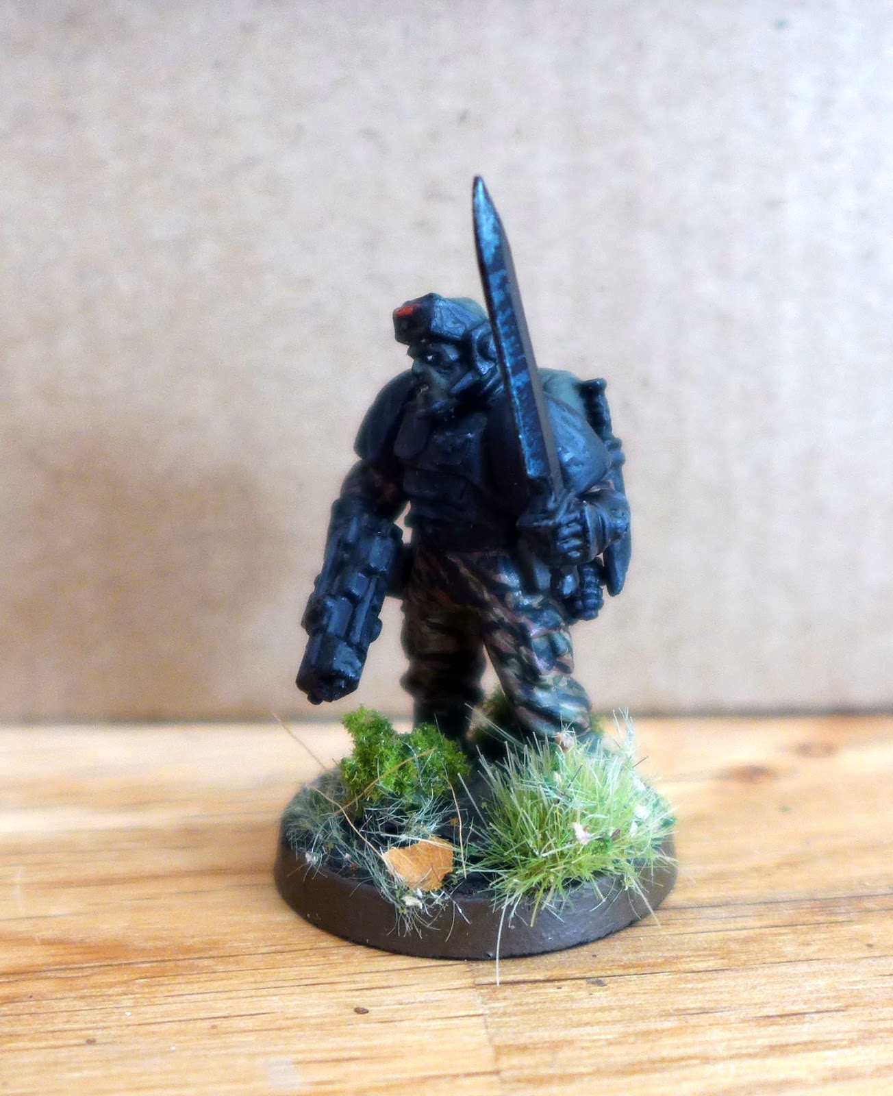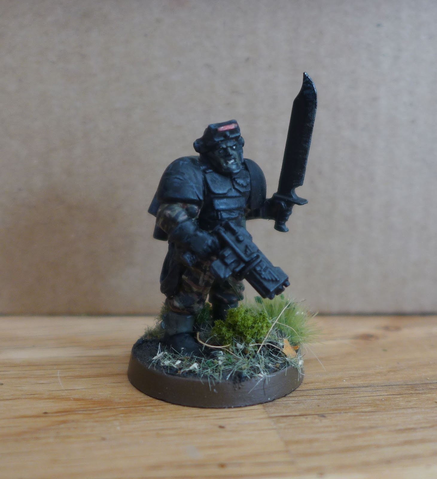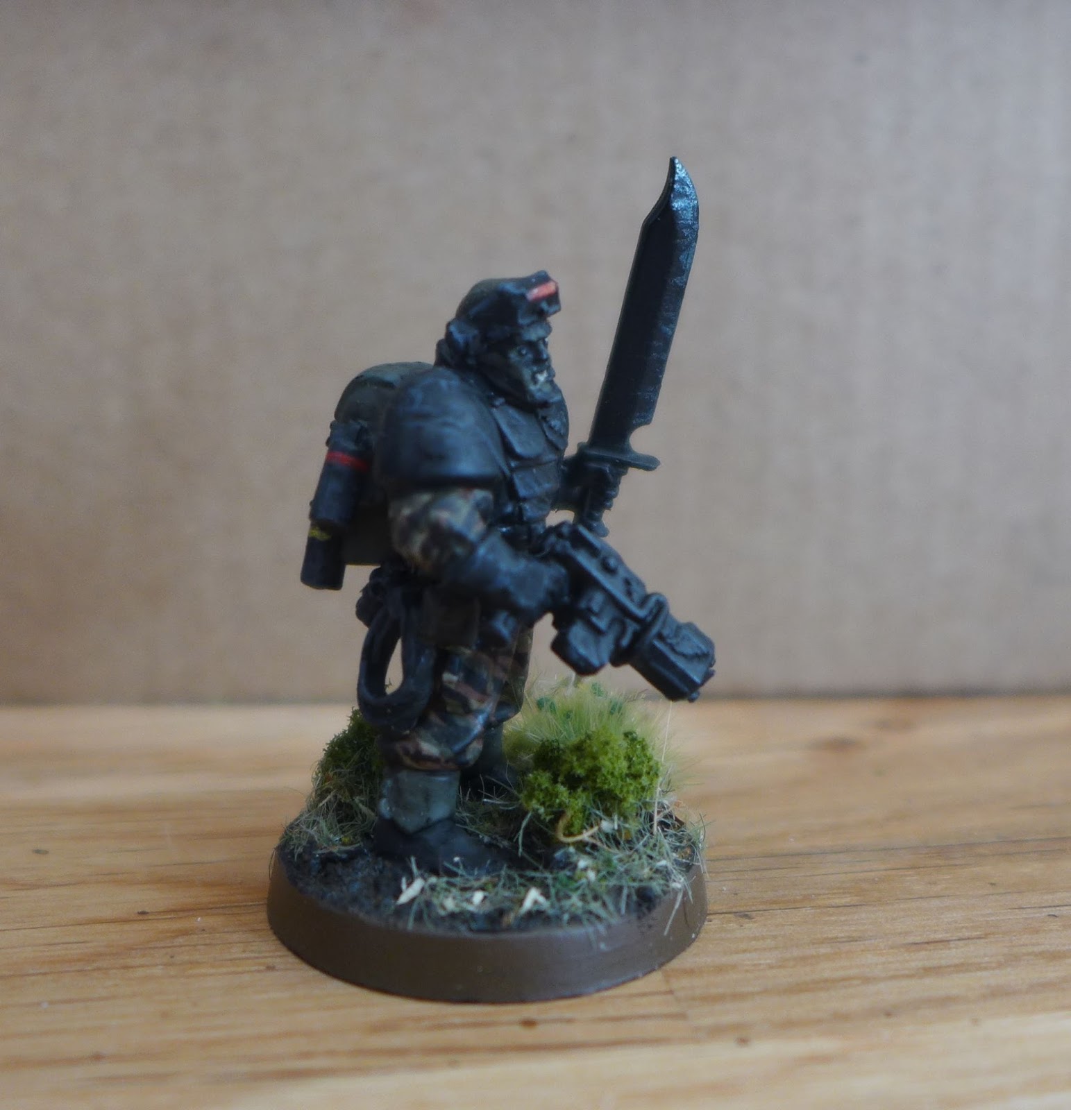 I thought he could be nice as a miniatures to represent Sly Marbo in warhammer 40k Imperial Guard. He is made from components from plastic Space Marine Scouts and Cadians.
