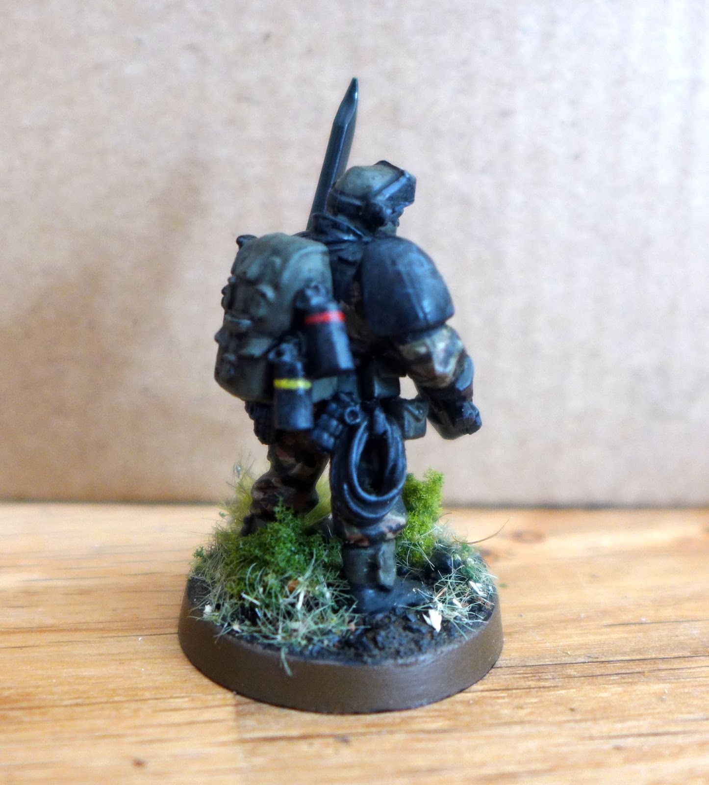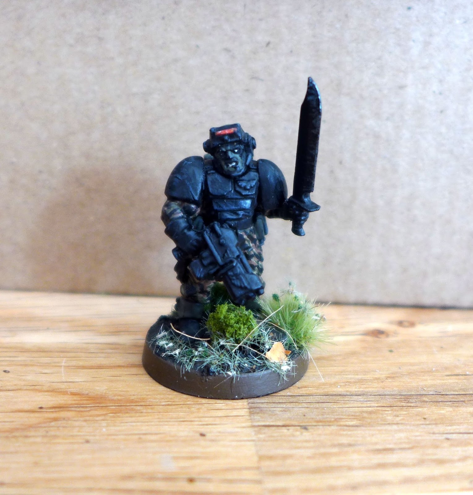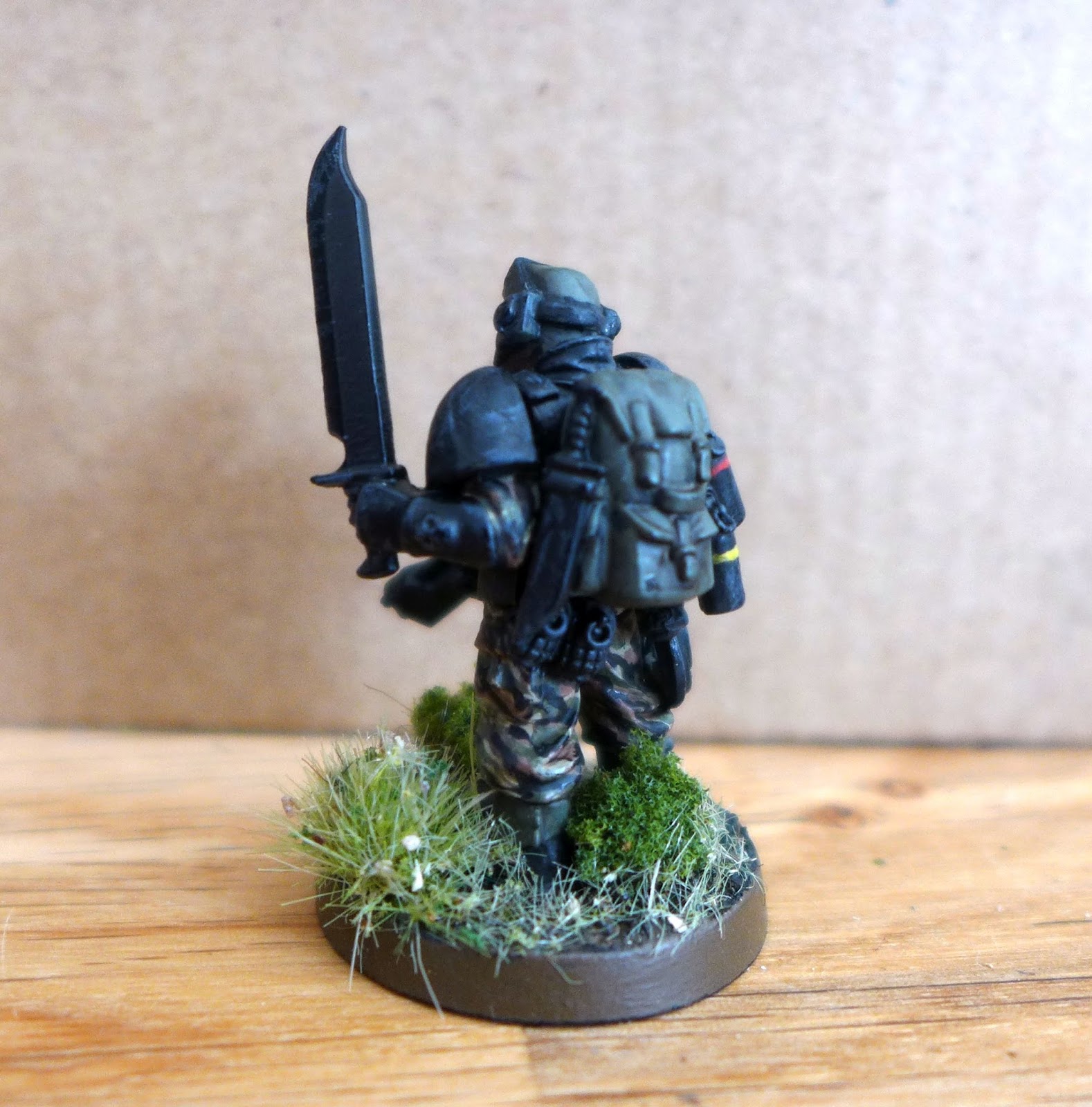 I thought he could be nice as a miniatures to represent Sly Marbo in warhammer 40k Imperial Guard. He is made from components from plastic Space Marine Scouts and Cadians.
