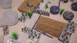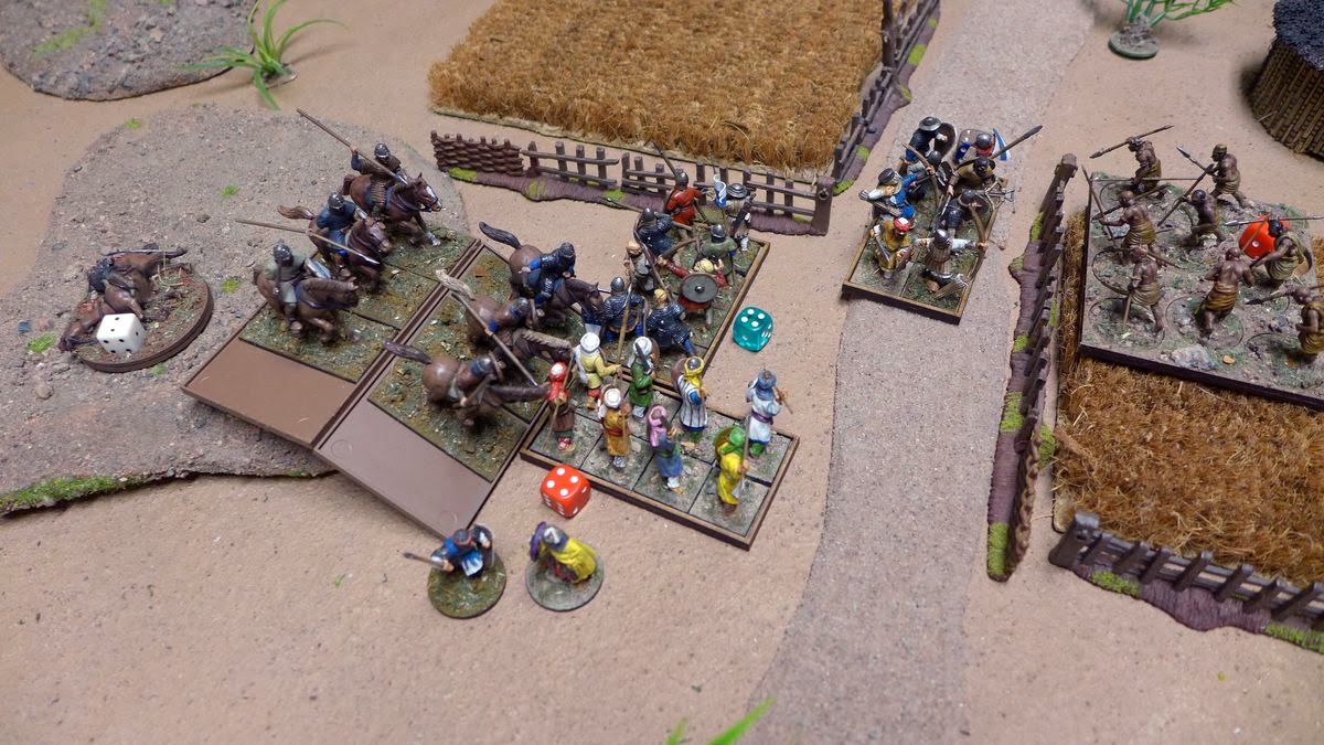 My opponent finally manages to move his cavalry and my Egyptian mob was shattered. The cavalry pushes forward and attacks a small unit of skirmishers that tried to find shelter behind a fence. Attacked in the flank and in front these guys was in big trouble.