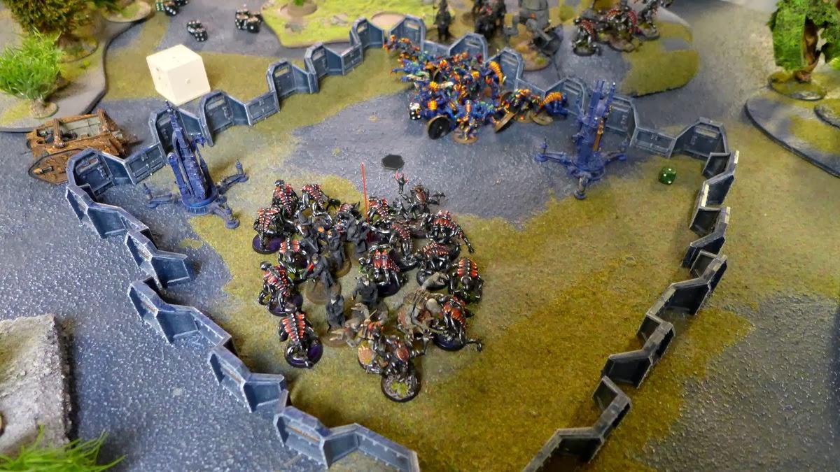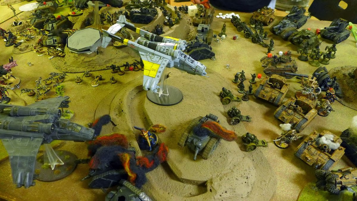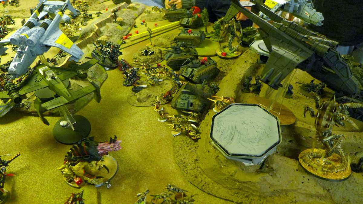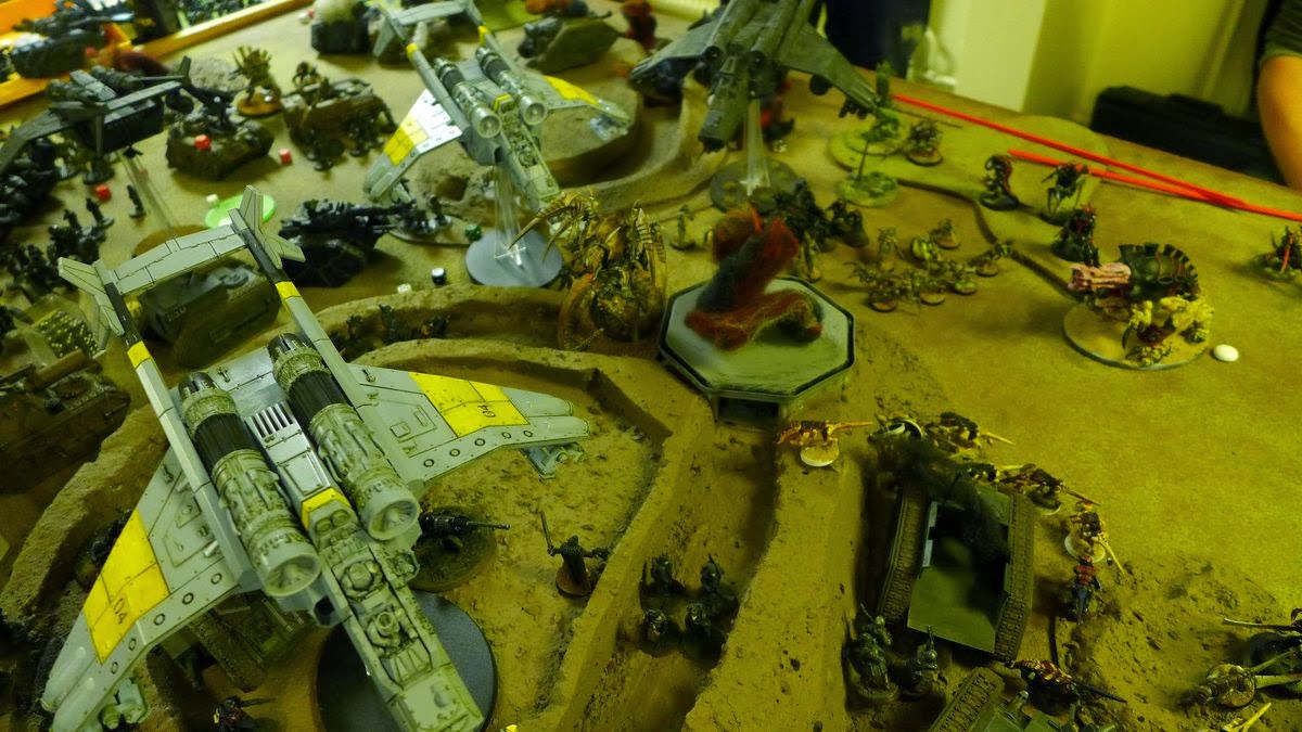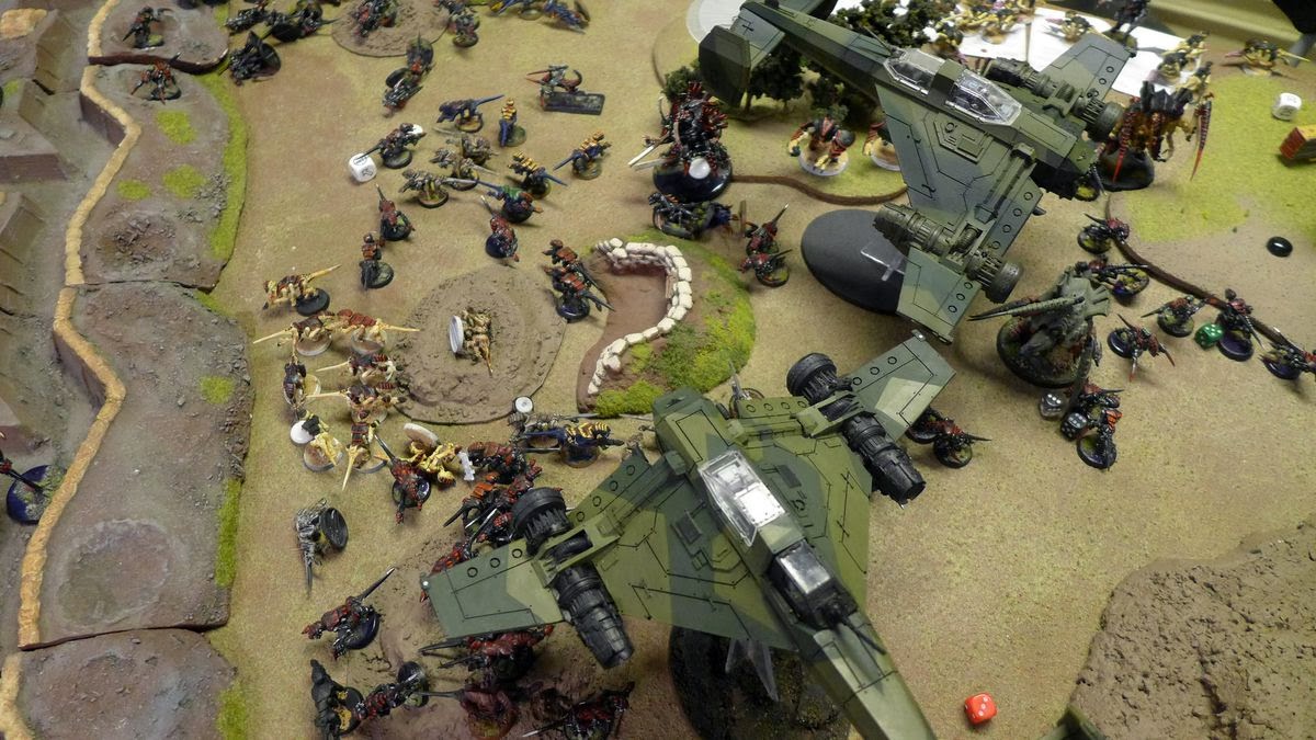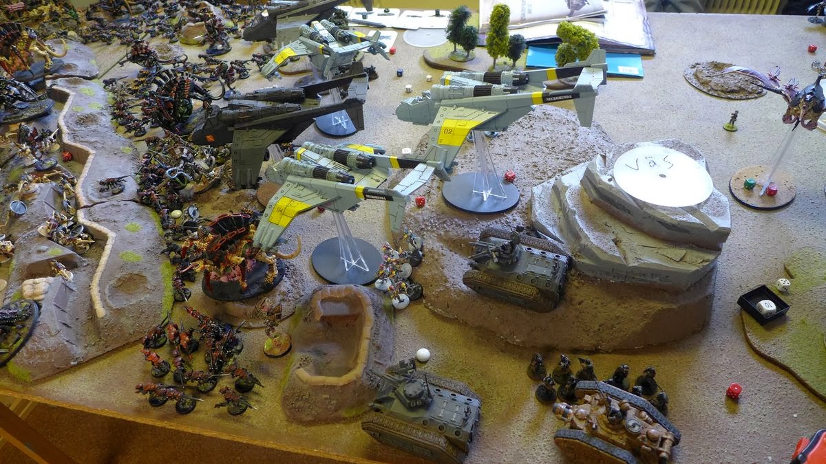 The aircav zooms in on the Imperial defences after a heavy flank attack of big monsters entering from reserve and hitting the Imperial guardsmen players hard.