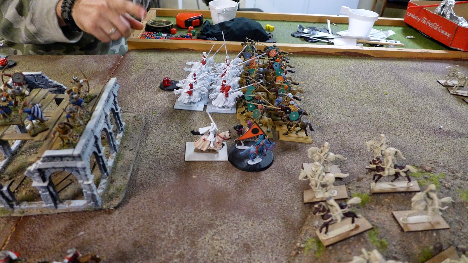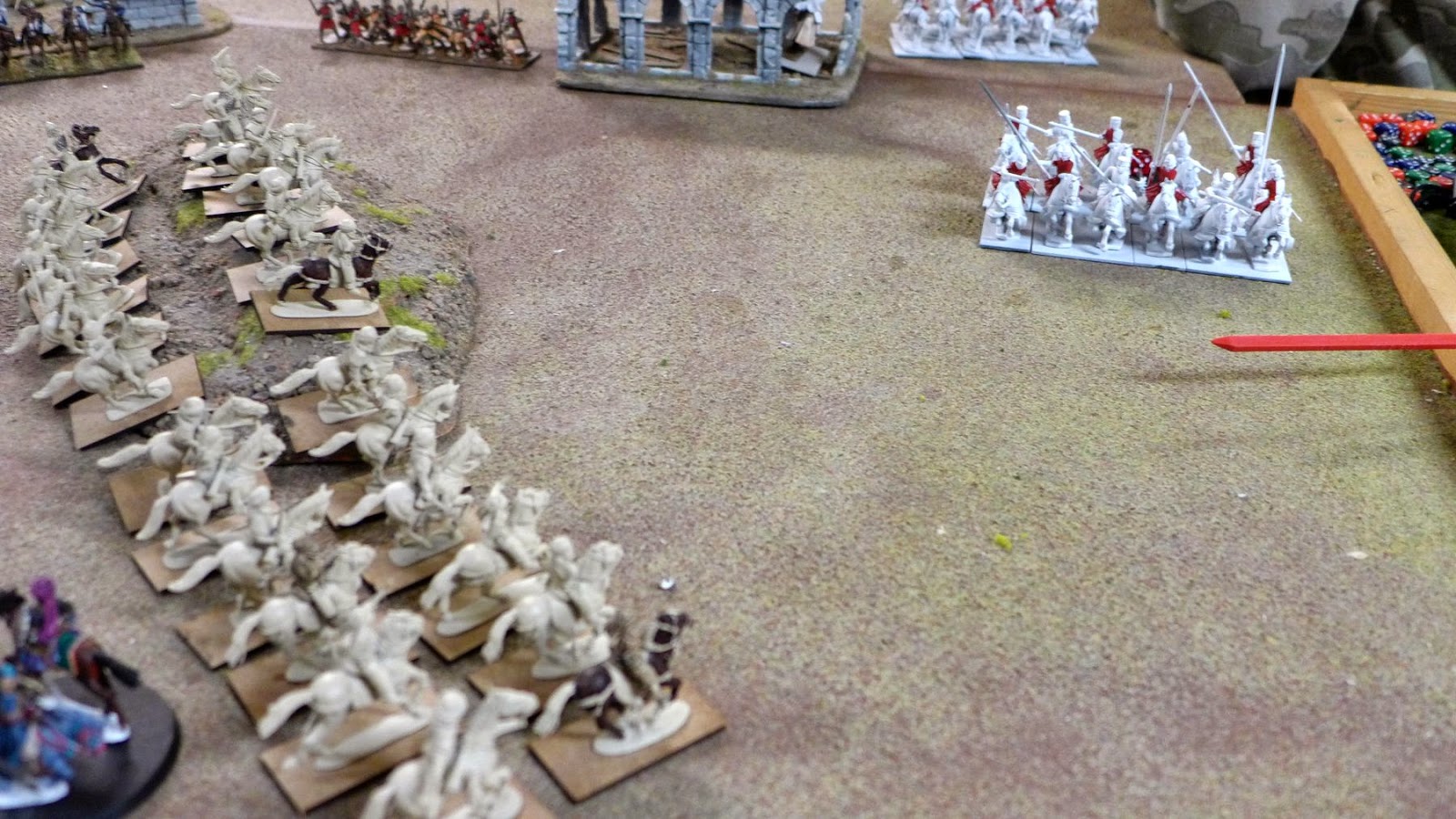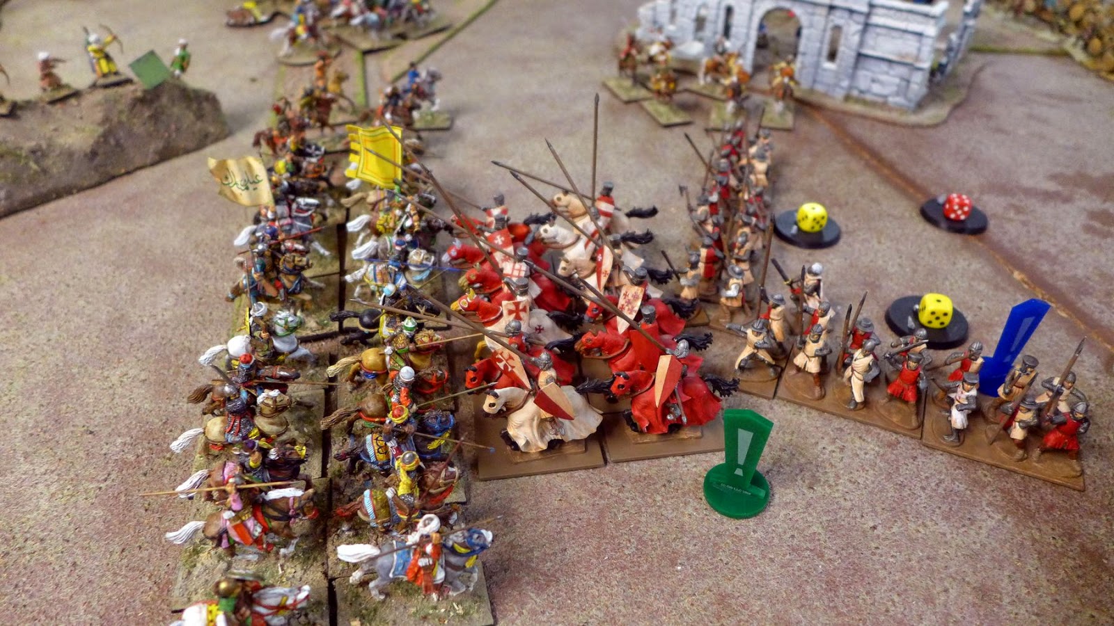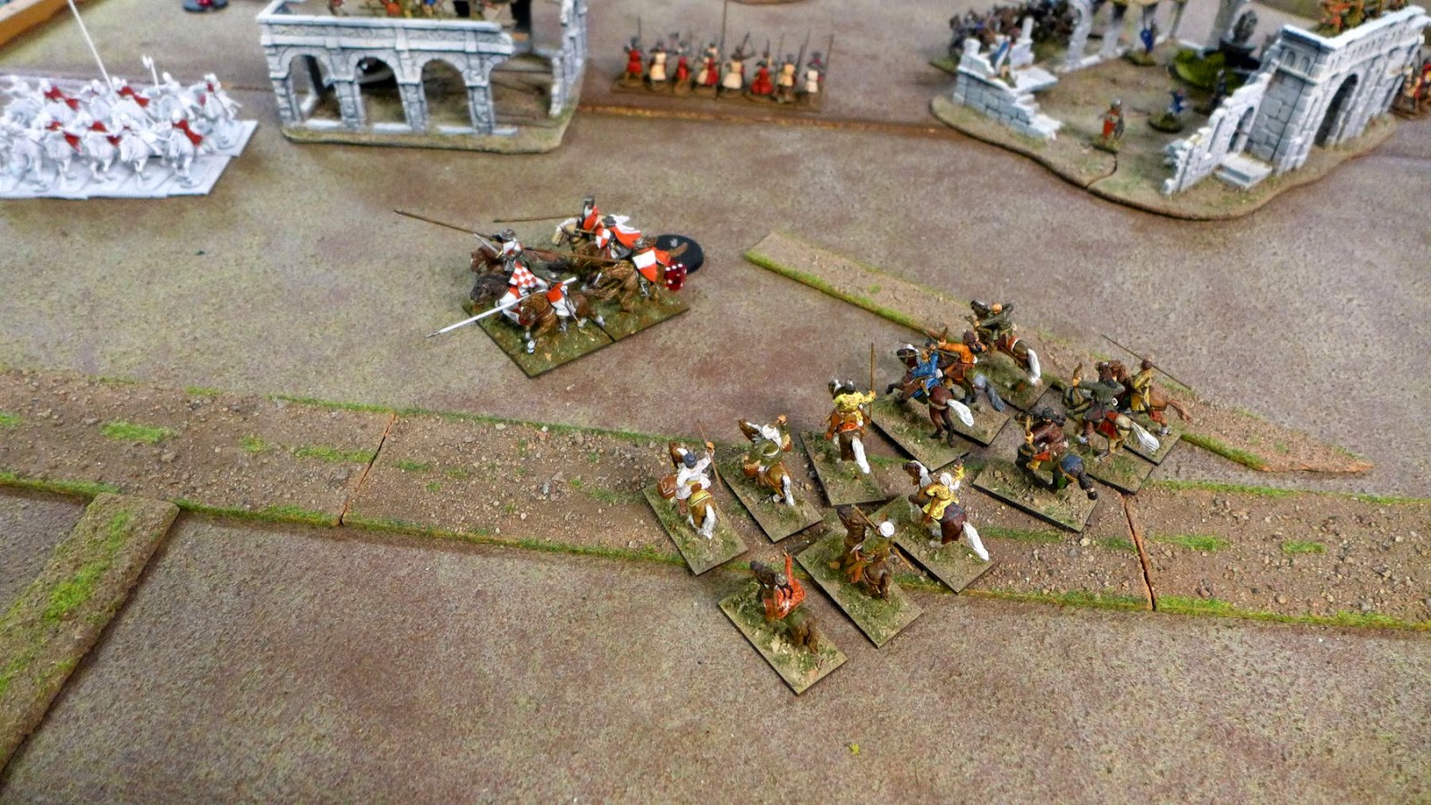 The knight totally crushed the medium cavalry units... The lance rule against medium cavalry makes their moral save 5+ into a 6+, this combined with the good dice rolling of Marco and the bad by Johan resulted in a big hole in the muslim line.