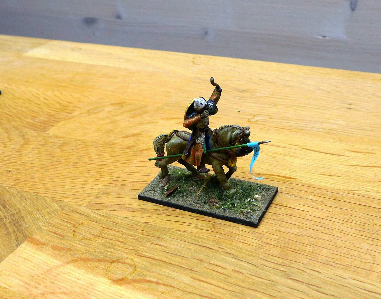 In one book I found the reference of how you should hold your spear/ lance under your leg as you shoot from your horse so I think this is only proper to simulate on your miniatures.