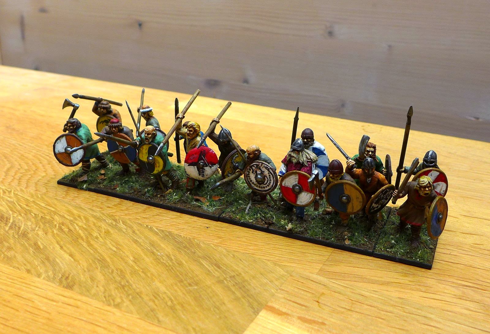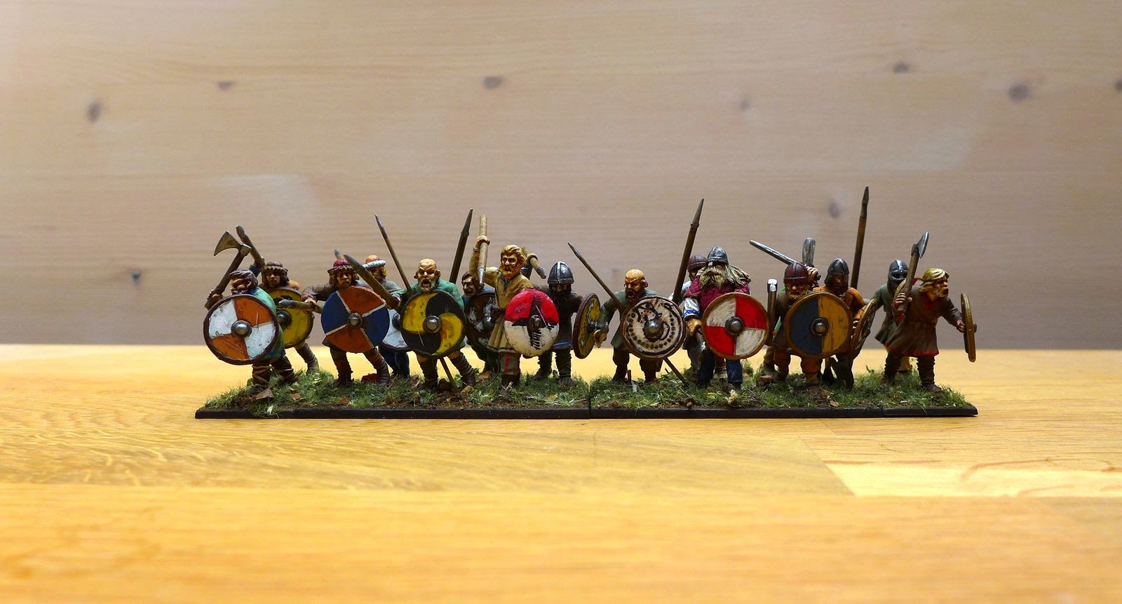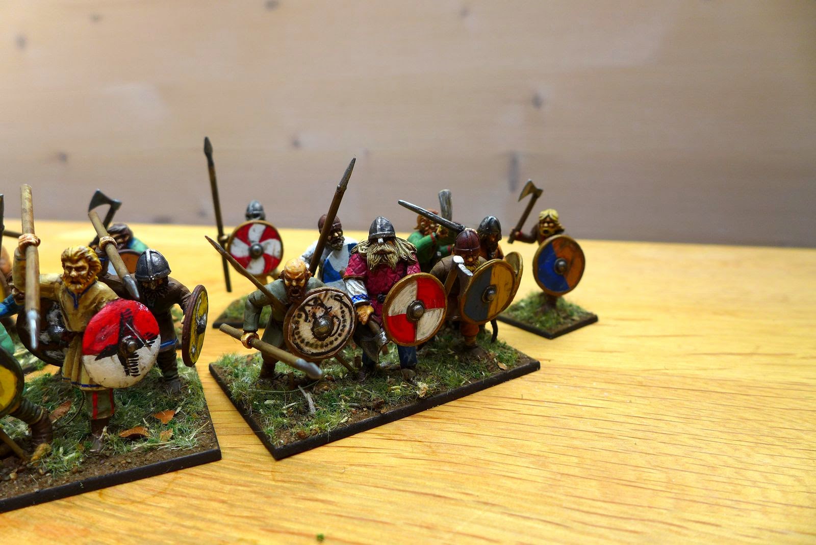 The miniatures are a mixture but the main mass of miniatures comes from Gripping Beast plastic Dark age warrior box. With some head swap from their Hirdmen box you get a nice Norse feeling to them and even better to throw in a metal miniature here and their for that added level of variation that make a unit look even more interesting.