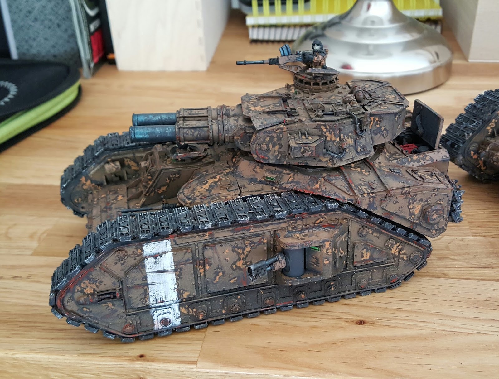I have started to apply some red "rost protection primer" on one of the Macharius tanks, showing where the paints have been chipped of.