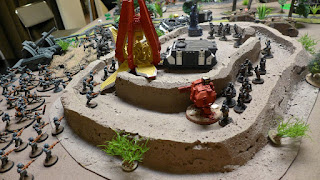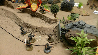Having declared a Forlone Hope at the start of the game I was able to call in another platoon of infantry. With more melta guns and throwing krak grenades I was able to destroy the weapons on that beast... But not totally silence it.