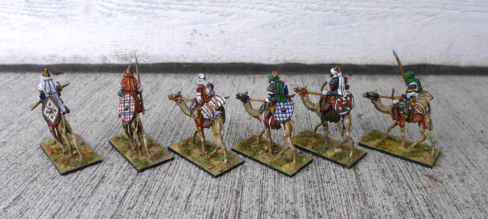 But here I finally have some Bedouin Camel Riders. The miniatures are from Warlord games and are originally intended to be Romans (https://store.warlordgames.com/products/eir-camel-rider-regiment). All I did was to add some plastic arms from the bit box instead and painted them in different colours.