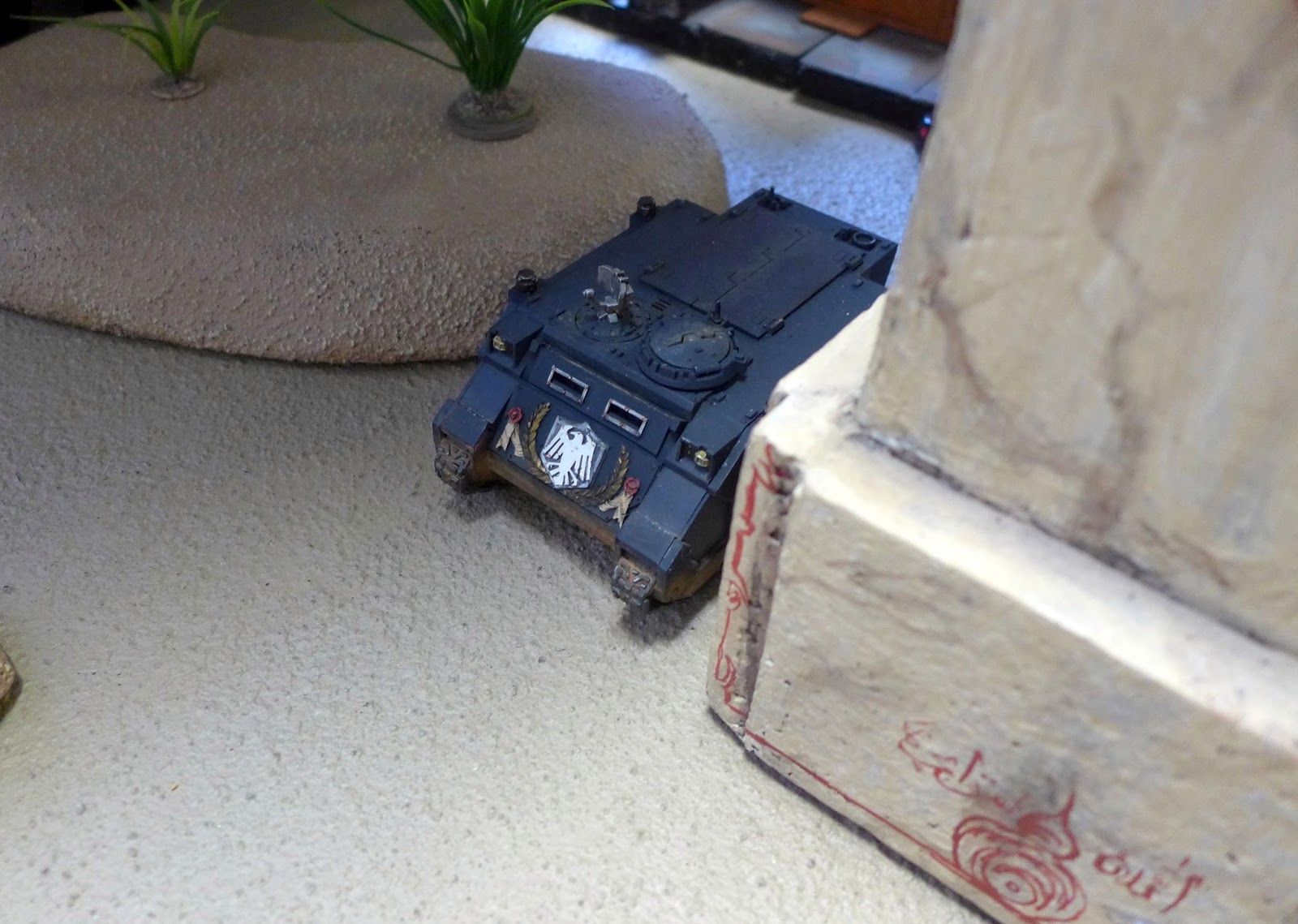 In an attempt to stop me from entering the tent and kill any surviving informers the Rhino with an stormbolter and an multimelta (they can get those in 30k... nasty..) charged through the wall and shoot at my squad of tacticals containing the sergeant but it could not do any damage.