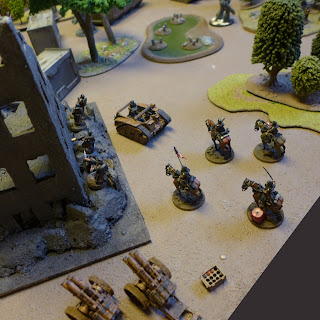 Grenadiers in the ruins, Macharius battle tank in the centre with Death riders acting close support.