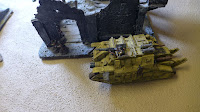 In this game my axe Veletaris saw close combat, they got charged by jump infantry and actually hold them up for a turn or two and inflicted casualties. Had the enemy not had a apothecary this could have been interesting... But they got smooched in the ruins they tried to hold. To bad, that apothecary was fielding a special weapon he had found in the game that my Veletaris Prime maybe could have taken if he had bested him in a challenge, but that was not to be. The weapon in questing was a bolt pistol with special radioactive ammunitions.