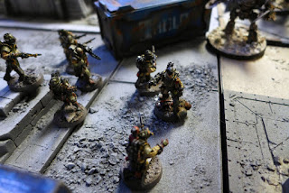 The Lord Marshal had set loose his xeno beast (count as charonite ogryns) and they were hunting traitor forces in the bomb out city ruins.