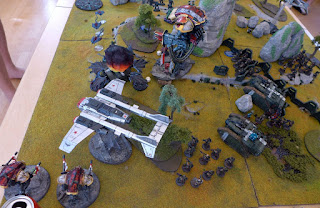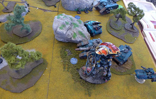 The Medusas of my Solar Auxilia are just in range to starts pummelling the poor squad in Rhino just between the two large rock formations..