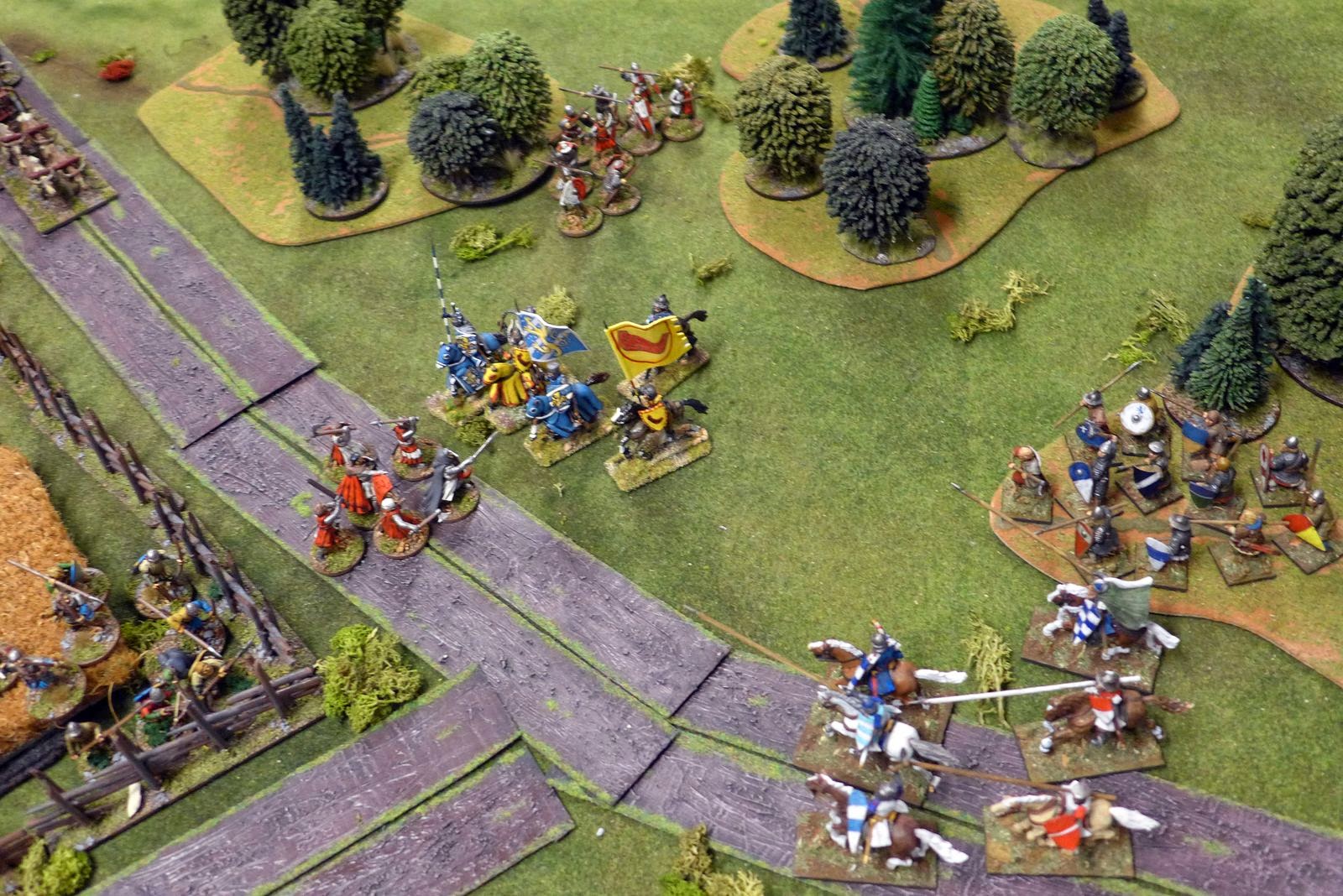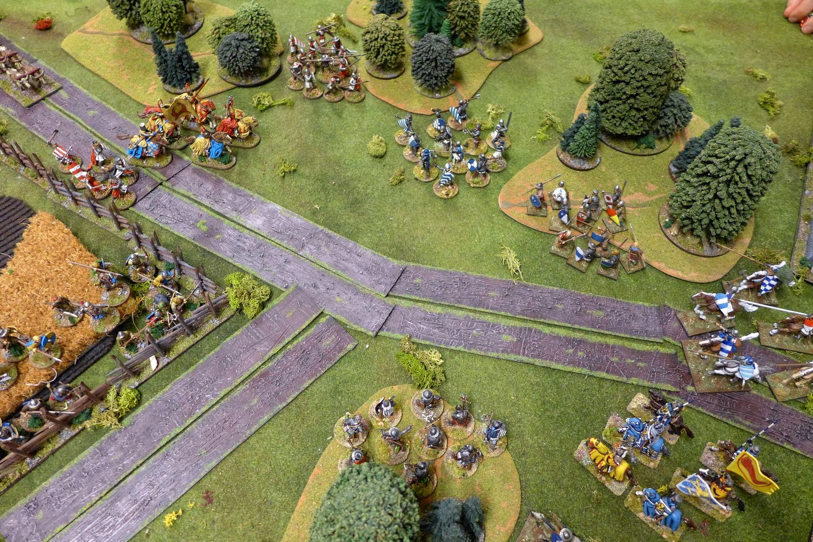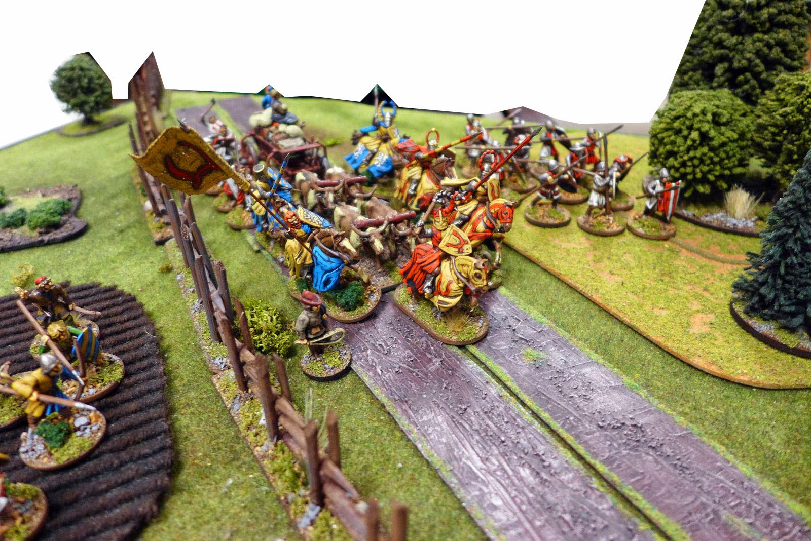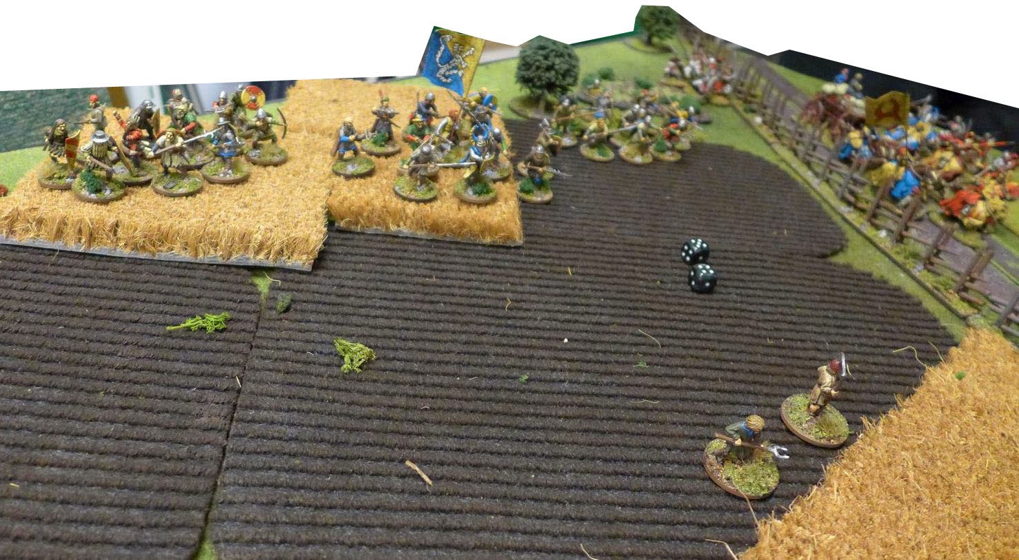 We used the Lion Rampant rules and I have really started to enjoy these. A deck of cards with the houses name and image was used to draw in which order each player was to command his troops. This is a fun way for multiplayer games.
