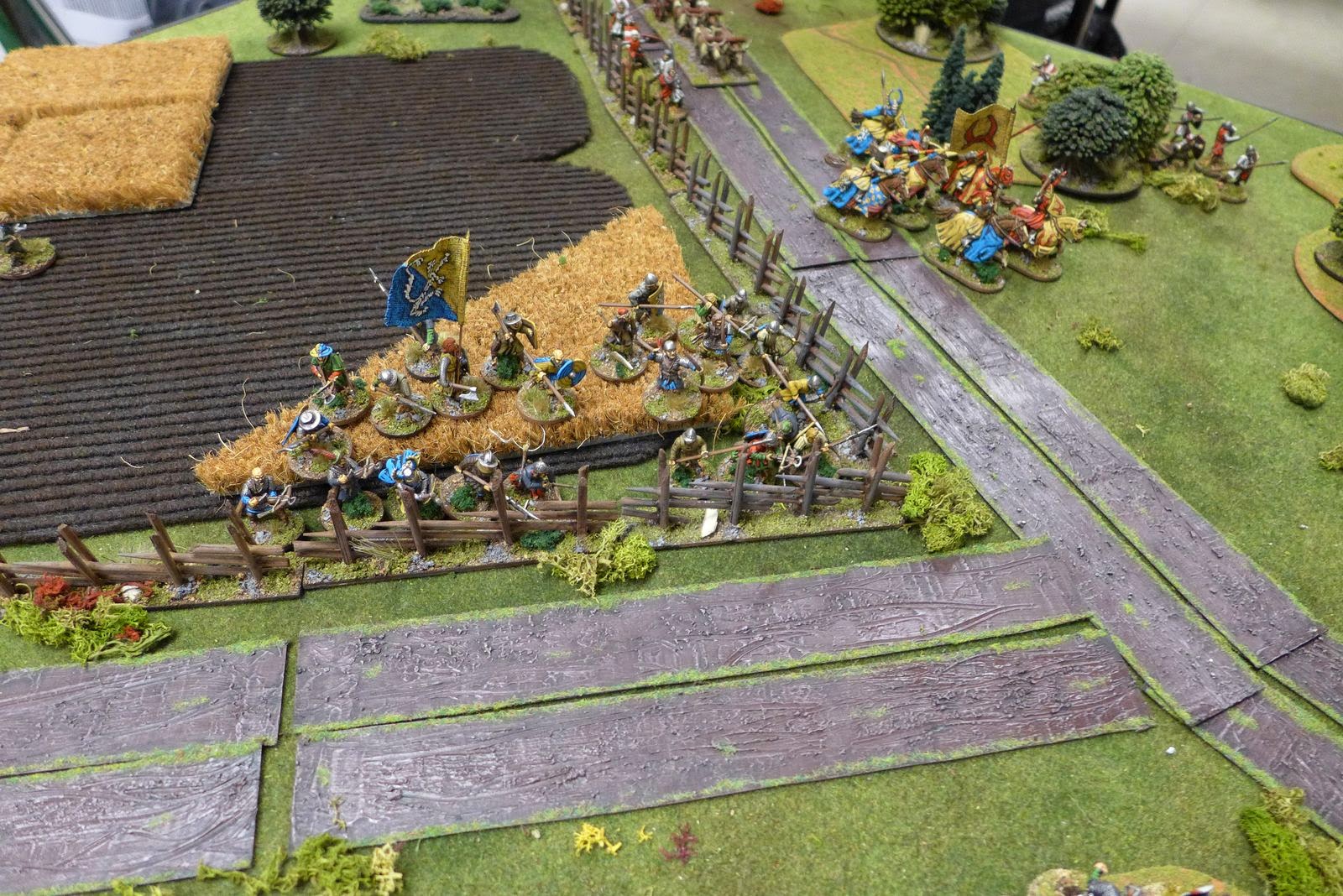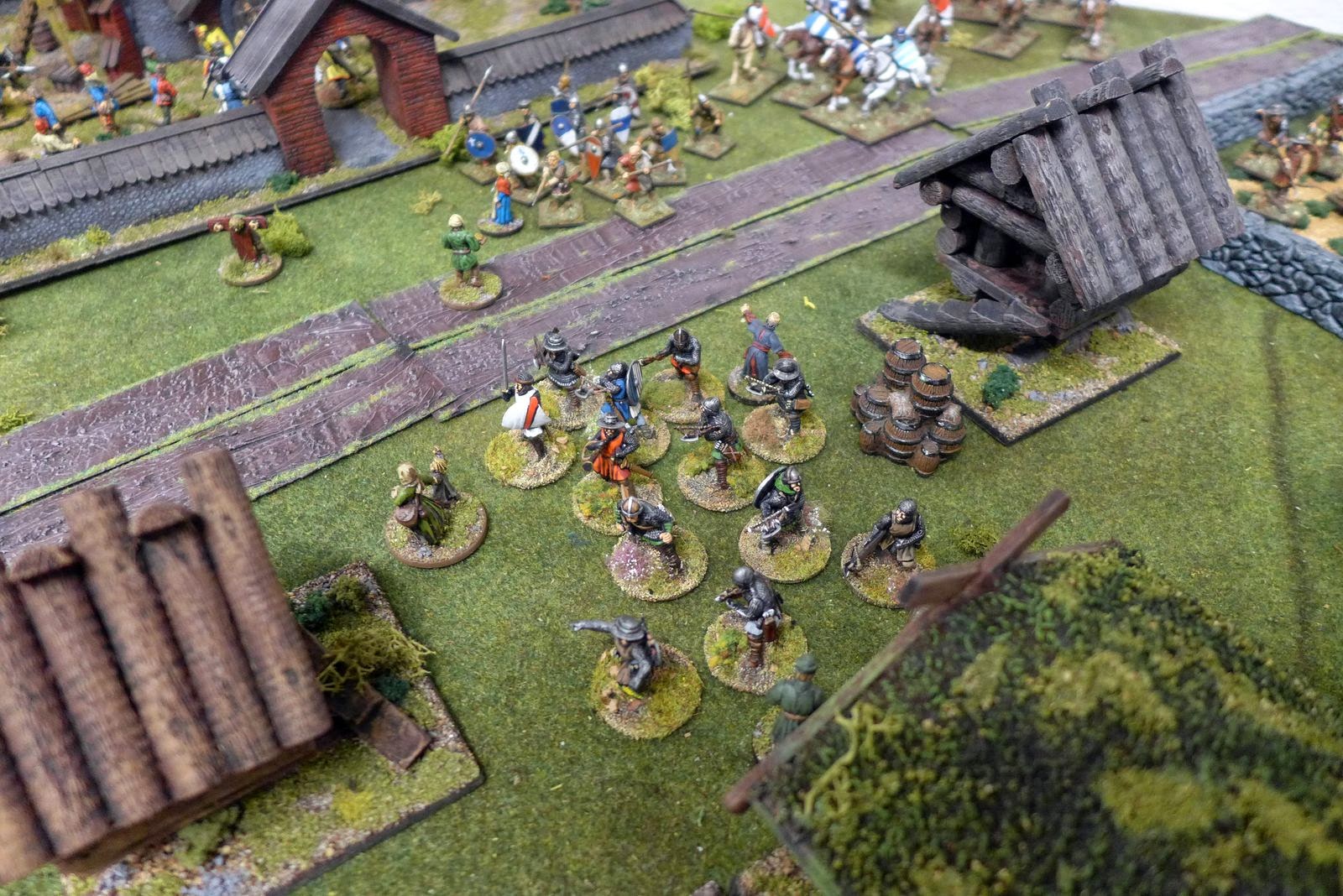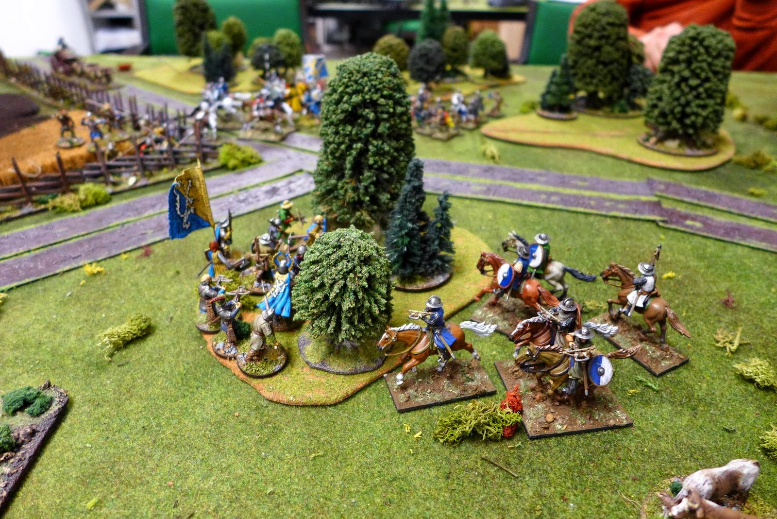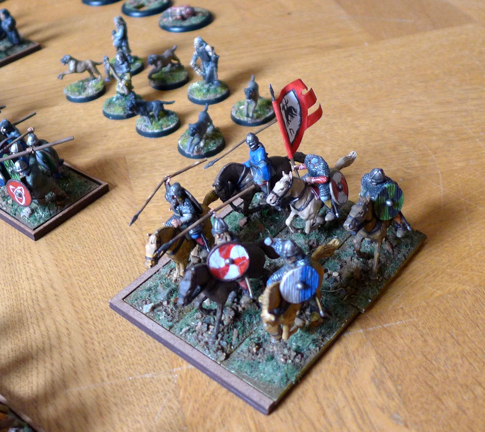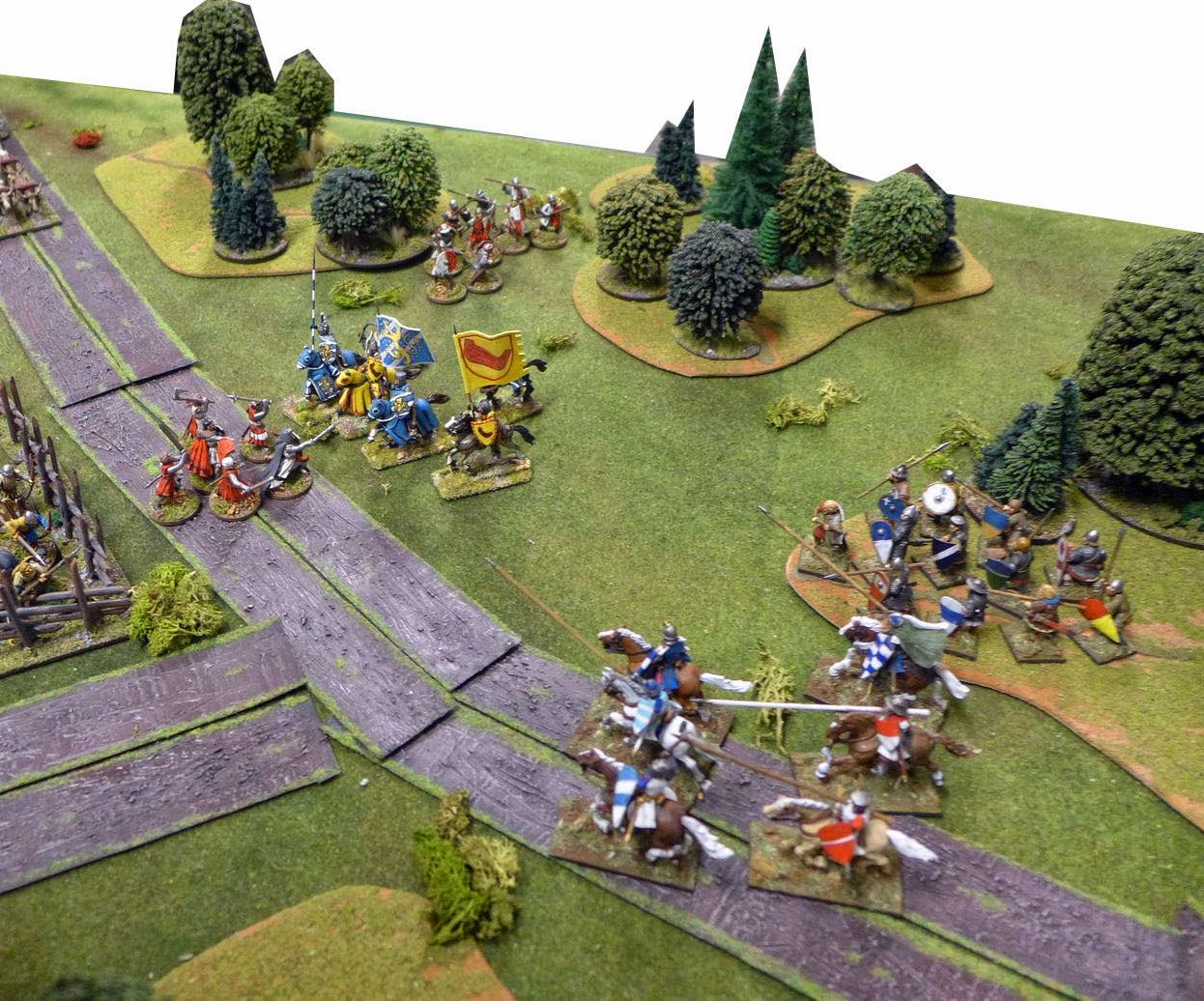 We used the Lion Rampant rules and I have really started to enjoy these. A deck of cards with the houses name and image was used to draw in which order each player was to command his troops. This is a fun way for multiplayer games.