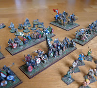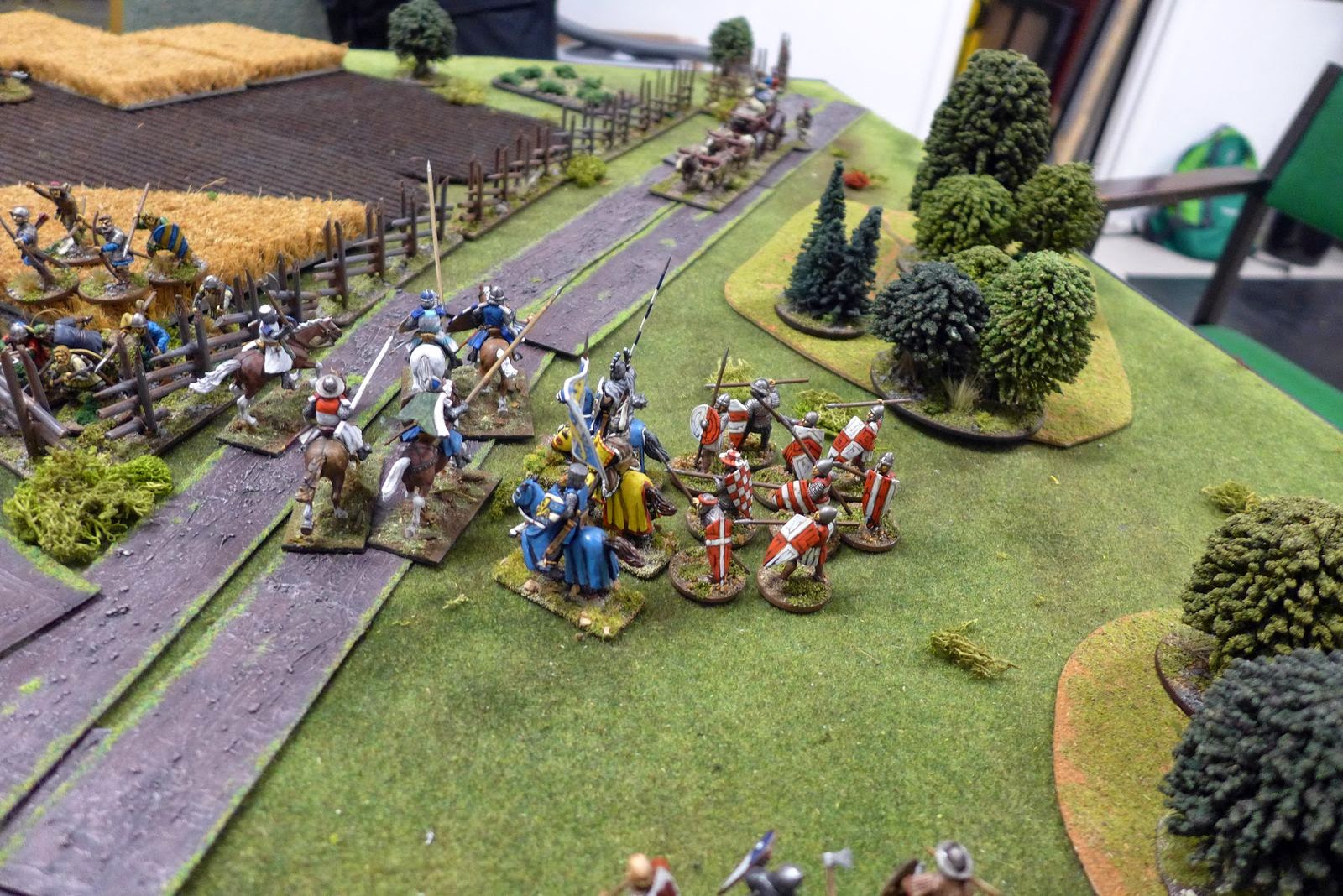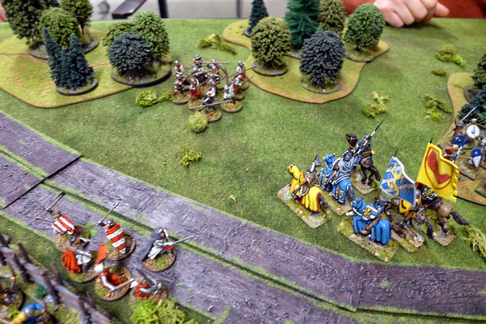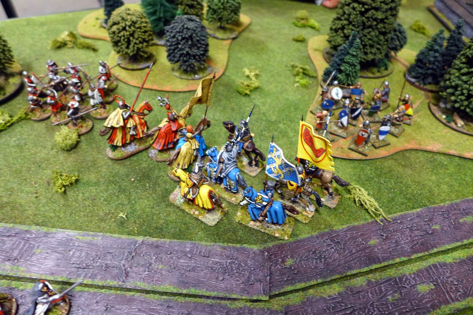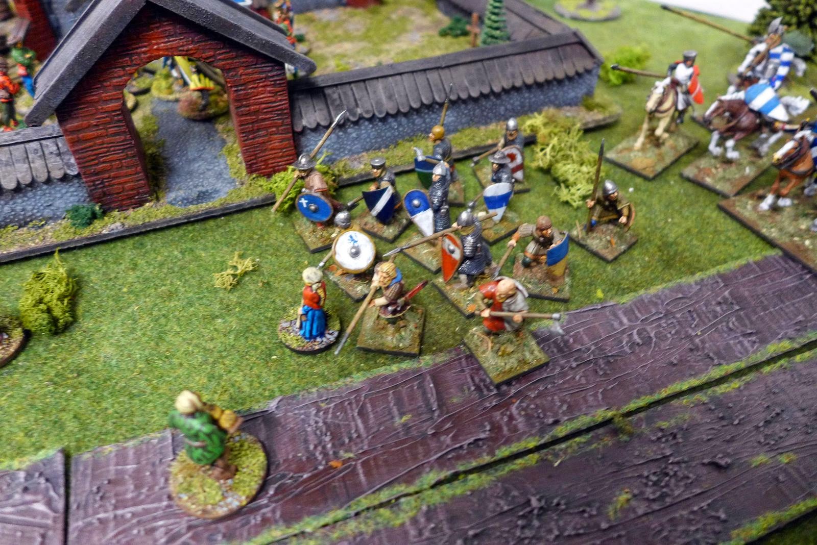 We used the Lion Rampant rules and I have really started to enjoy these. A deck of cards with the houses name and image was used to draw in which order each player was to command his troops. This is a fun way for multiplayer games.