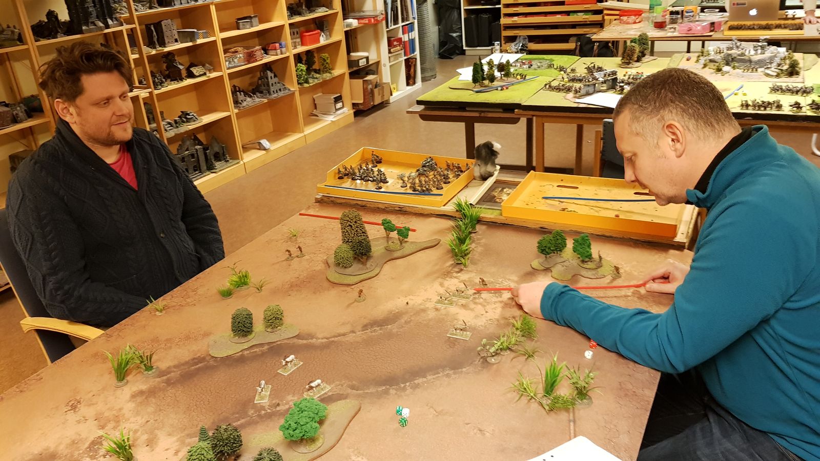 I had six villagers scattered around the table and the goal of the scenario would be to kill atleast three of them in eight turns and suffer less casualties then the defenders.
