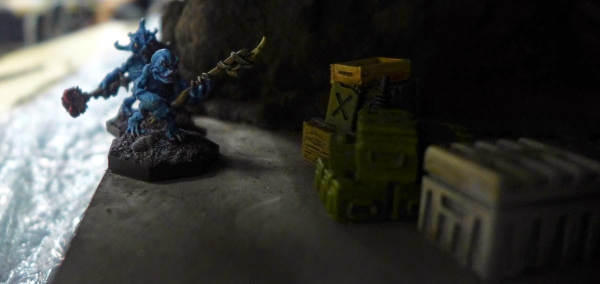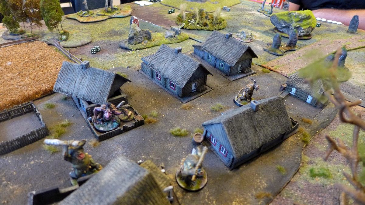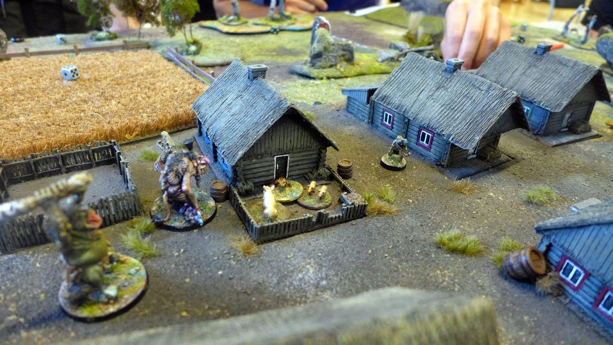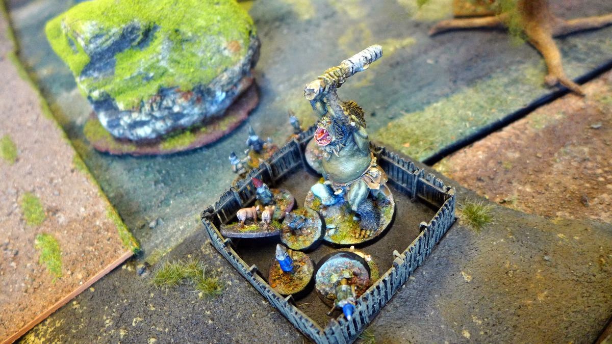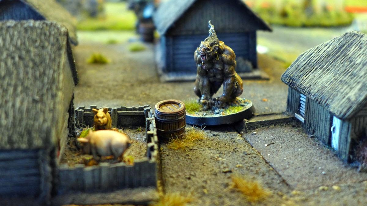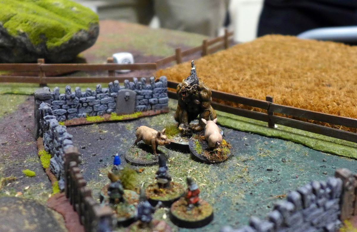 In our Trolls and Gnome game one of the trolls have here entered into a pigsty only to be attacked by the gnomes living in the village.