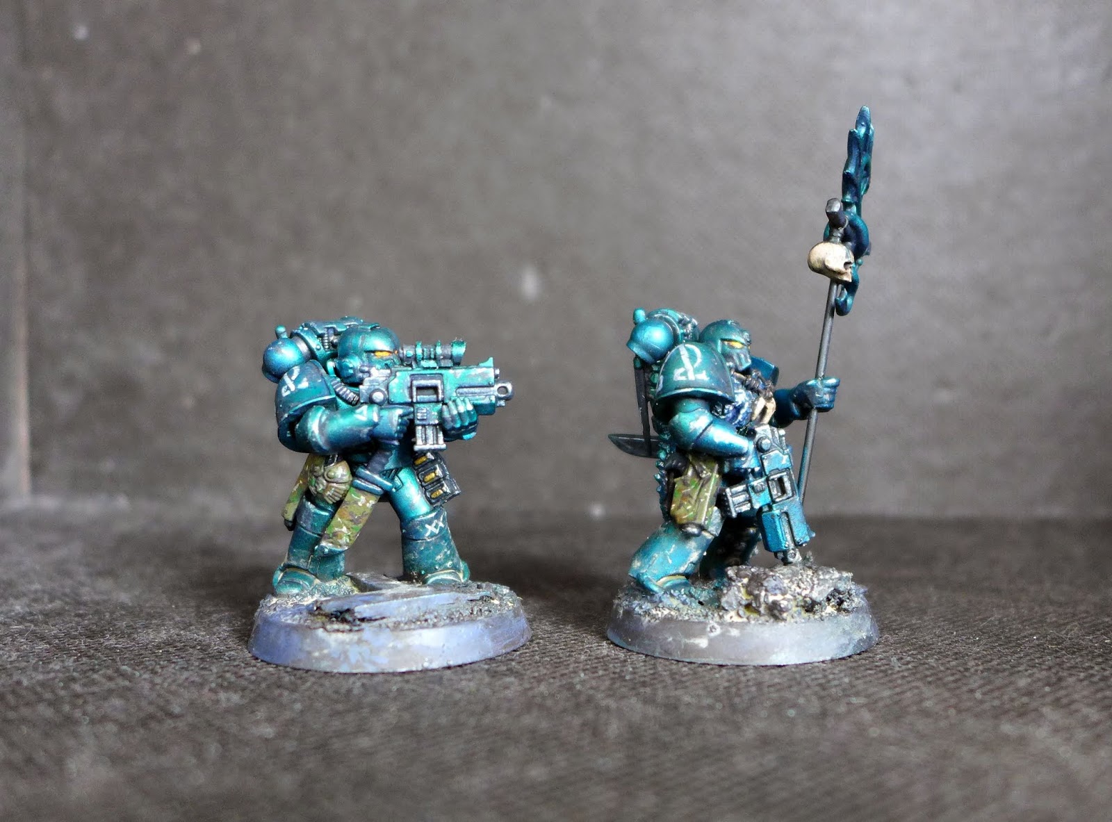 I wanted to raise the standard on them. This is a collection of reinforcement miniatures, two combi plasmas for a veteran squad, a vexilia and a couple of standard Legionnaires for a regular tactical squad with additional hand weapons.